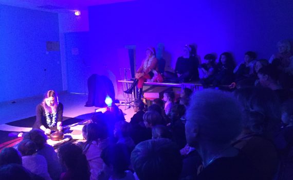 EN RYTHME : Des sons inspirées des quatre coins du monde reviennent comme un refrain grâce à des instruments atypiques. Sur la scène les interprètent dansent avec d’ immenses étoffes de tissus multicolores qui volent, tourbillonnent et s’entortillent au fil des aventures.